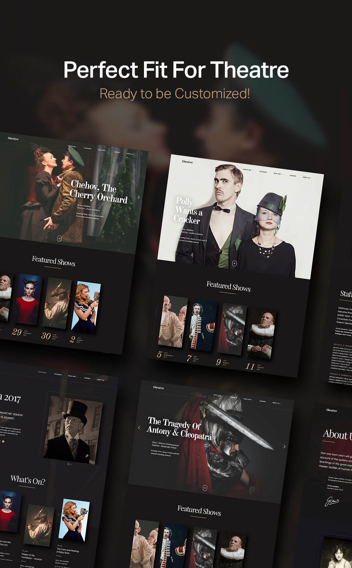 Theatre WP is a premium WordPress theme for theaters. Its unique features and functionalities make it the ideal solution for websites dedicated to theater, arts and other similar activities. It is suited for any type of theater, ballet, arts gallery and others.