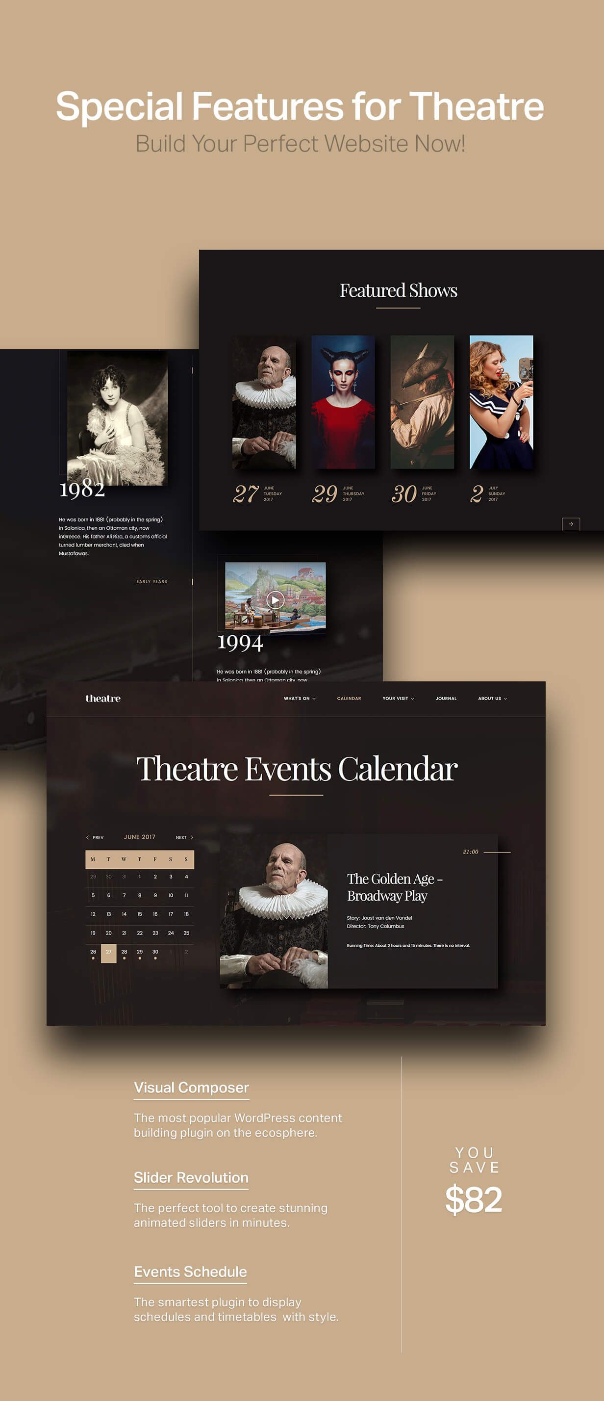 Our theatre wp theme is designed for visually impressive websites, with large sliders and images, stunning carousels and generous footers. We’ve tailored the theme to a theatre needs, so you will find custom functionalities such as event schedules, that will help you build a gorgeous website in no-time.