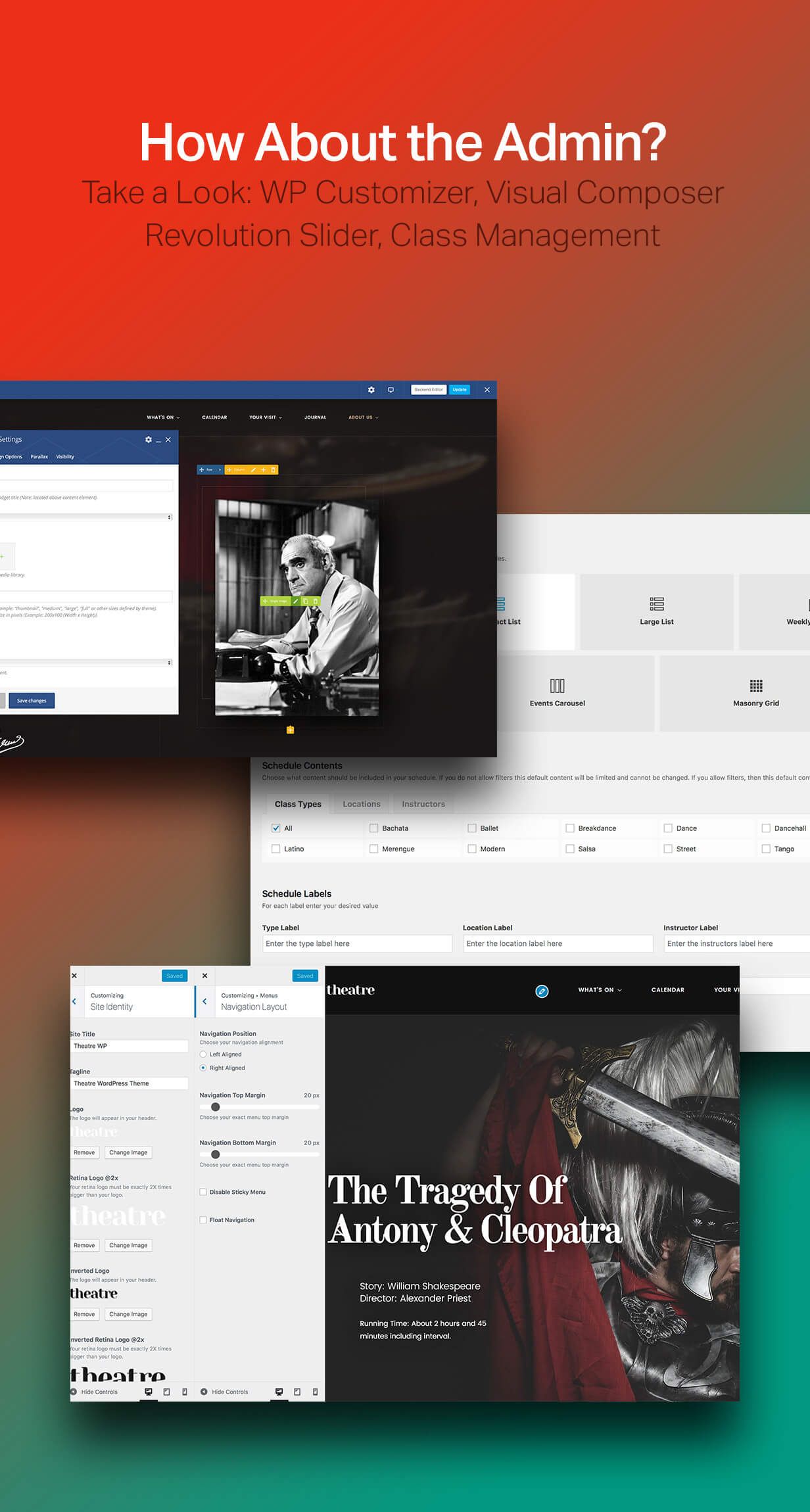 Theatre WP improves standard WP options with an extended Customizer that allows you to tweak everything to your needs.