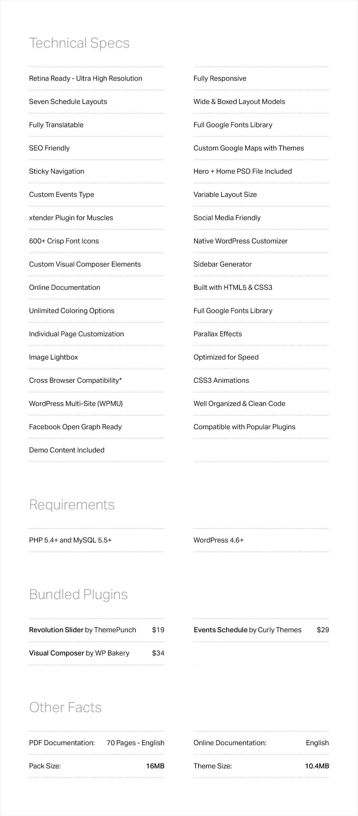 You can get a head start by building directly on our demo content, a framework with ready to use pages and posts, menus, widgets and other elements. We include demo content also for Revolution Slider and Events Schedule plugins. Recreating our demo should be a breeze.