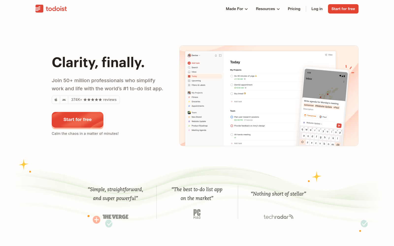 Trusted by 30 million people and teams. Todoist is the world's favorite task manager and to-do list app. Finally become focused, organized and calm.