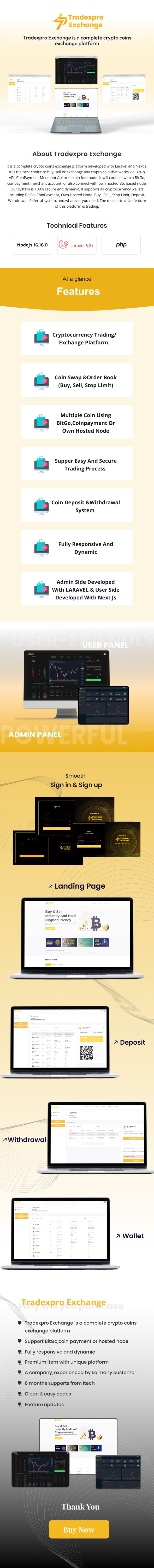 Tradexpro Exchange is a complete Crypto exchange platform that is developed with Laravel, MySql, and Nextjs. It is the best choice to buy, sell or exchange any crypto coins that work via BitGo, CoinPayment, and own hosted node. It will connect with a coin payment merchant account, or also connect with a personally hosted node. Our system is 100% secure and dynamic. It supports all cryptocurrency wallets including Coin Payment, Buys, Selling, Stop Limit, Deposit, Withdrawal, Referral system, and whatever you need. The most attractive feature of this platform is trading. In the trading system, you can place buy and sell orders according to your preferences of coin prices. Besides that, you can check your balance from the wallet section. You can also check your buy-sell transaction status, deposit, and withdrawal histories. Additionally, it supports multi-language.