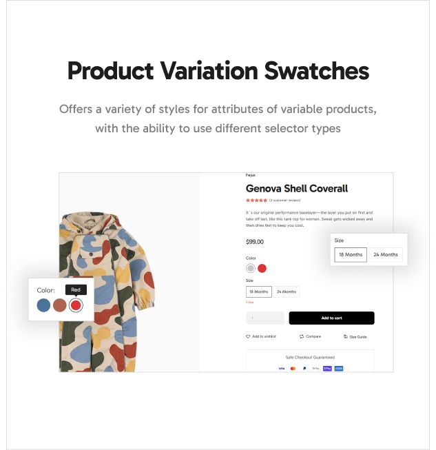 – Product Variation Swatches offers a variety of styles for attributes of variable products, with the ability to use different selector types.