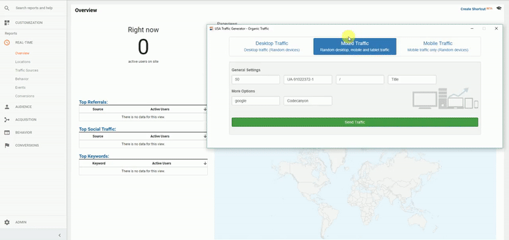 USA Traffic Generator – Organic Suite is a platform where you can send hits/sessions to your website visible through Google Analytics without tools like VPN or Hitleap trash traffic and wthout any risk of crash your servers or affect to your ad revenue account. This tool only work with Analytics and only provide traffic from USA.