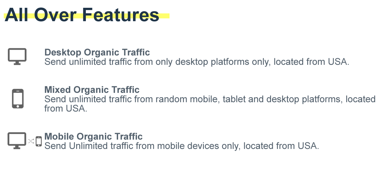 Send unlimited traffic from random mobile, tablet and desktop platforms, located from USA.