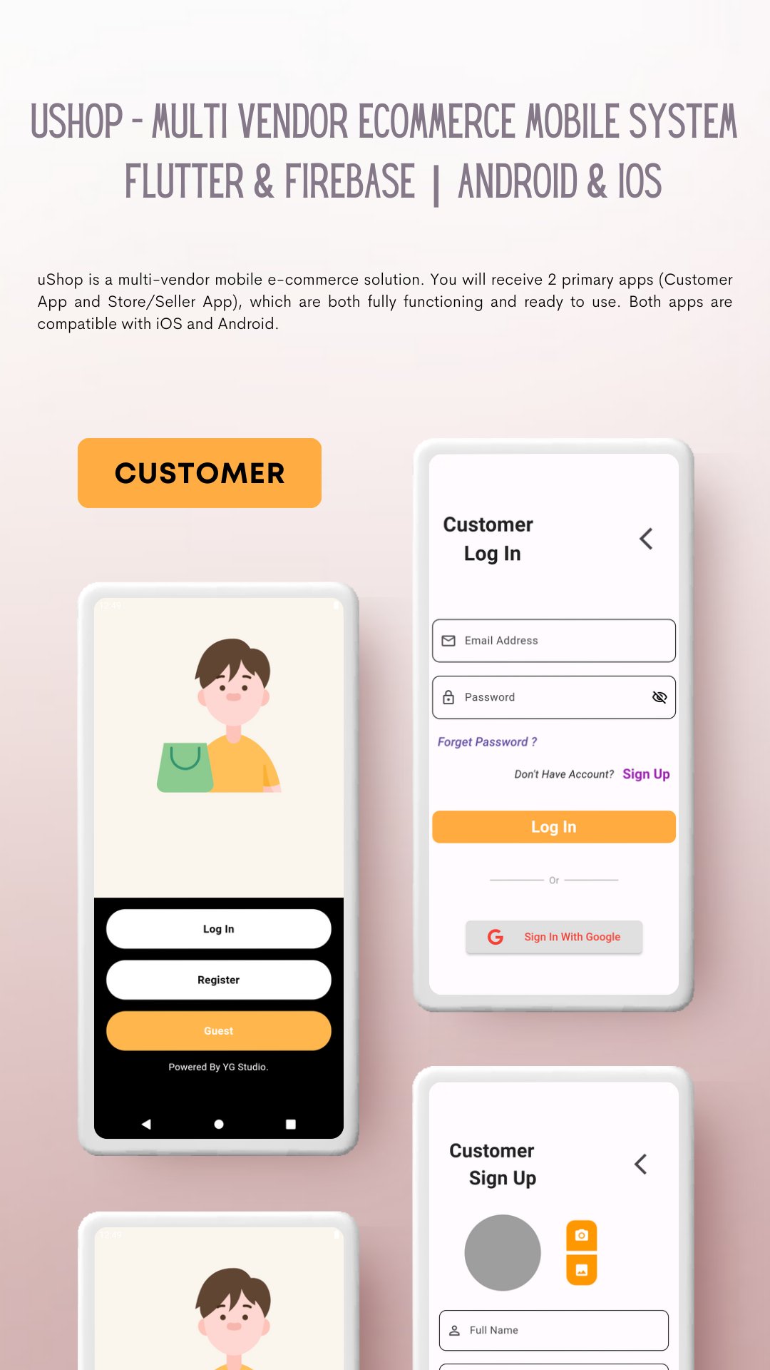 Description: uShop is a multi-vendor mobile e-commerce solution. You will receive 2 primary apps (Customer App and Store/Seller App), which are both fully functioning and ready to use. Both apps are compatible with iOS and Android. We offer a well-written installation manual (Documentation) that is simple to use. And this system is built on Flutter Framework & Cloud Firebase.