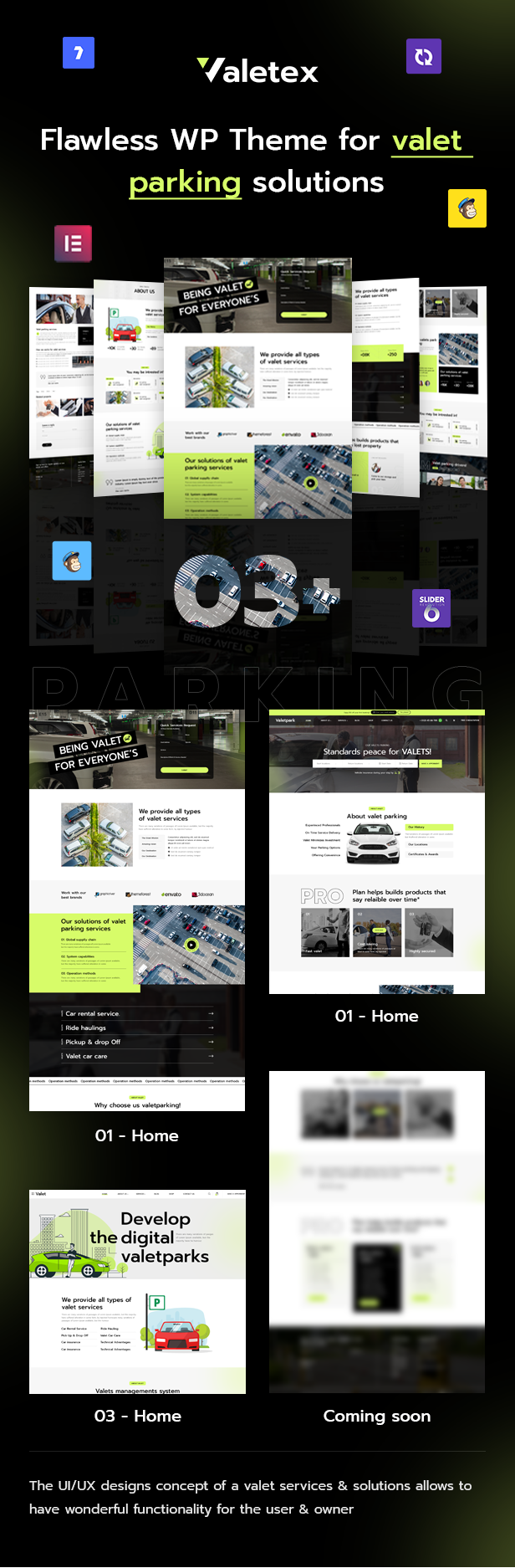 Valetex is a modern, creative and highly customizable WordPress Theme built for Valet Company, Parking Booking, Parking Management services website
