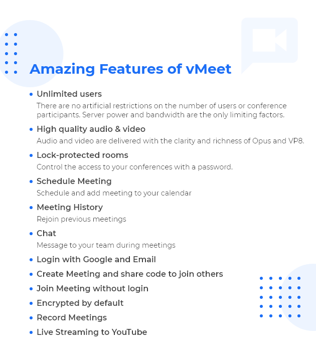 VMeet lets you stay in touch with all your teams, be they family, friends, or colleagues. Instant video conferences, efficiently adapting to your scale. Unlimited users: There are no artificial restrictions on the number of users or conference participants. Server power and bandwidth are the only limiting factors.