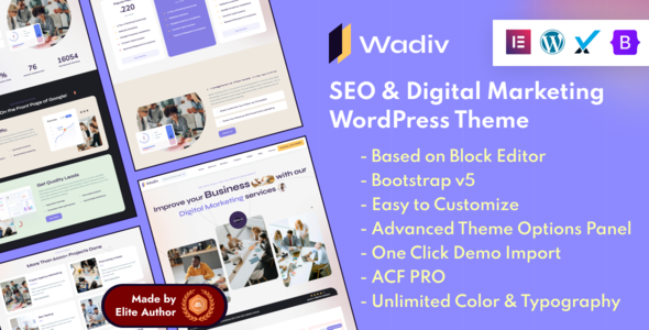 Wadiv is a modern, creative, and beautifully crafted responsive WordPress Theme built for SEO Digital Marketing services website. It comes with full niche demo variation, blog, and inner pages. The theme is developed using WordPress Gutenberg Block Editor, Redux, ACF Pro, and Bootstrap 5.