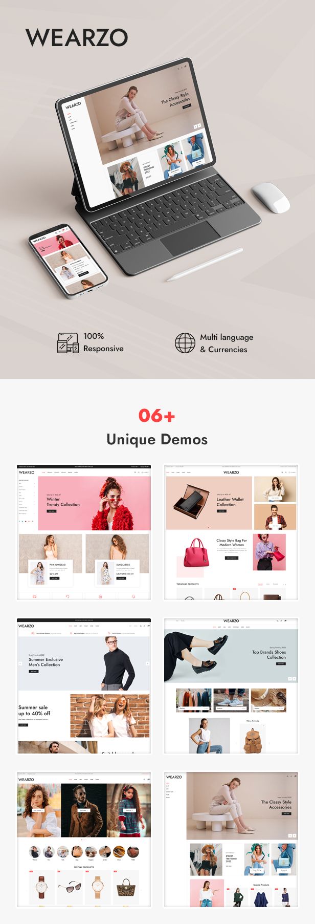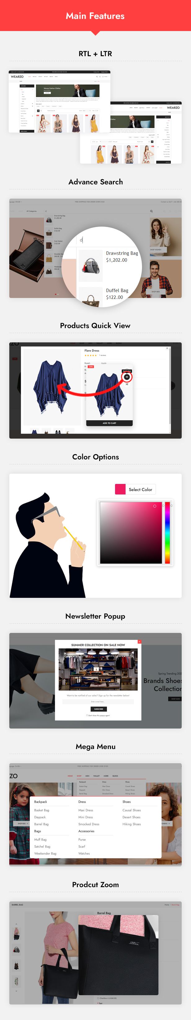 Wearzo Responsive OpenCart 4 Theme is a modern template, which looks great in Mobile, Tablet as well as Desktop. People who wants to developed online store for clothes, party wear, watch, bag, belt, jacket, jeans, shoes, clothing, jwellery, earrings, wallets, goggles, footwear, dresses, trousers, clothing store, accessories, fashion, e-commerce, opencart, shopping, or any kind, this theme going to be the best solution. The Theme is truly professional and looking great with the color combination.