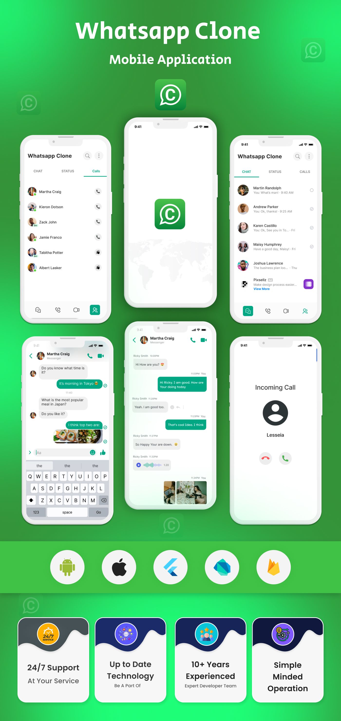 WhatsApp Clone, developed with Flutter and integrated with Firebase, offers cross-platform compatibility, native-like performance, rapid development with hot-reload, customizable UI, seamless backend integration, scalability, and a supportive community. With WhatsApp Clone , you can quickly build a feature-rich WhatsApp clone app that works smoothly on iOS and Android, leveraging Firebase’s powerful backend services for real-time messaging, user authentication, cloud storage, and more.