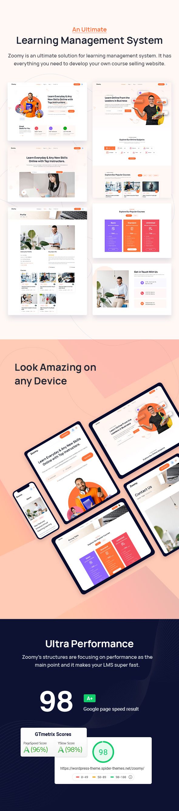 Zoomy is a clean, modern and unique WordPress theme that has beautiful design and unique features. This will be the best suited for your educational purpose website like university, college, school, kindergarten, online courses, blog, academy, courses, education, education center, education WordPress, tuition, tutoring, business, events, institute, learning, teacher and much more. This template is suitable for Education Course Learning Management System website. Zoomy template has a fully responsive layout. It fits perfectly on various displays and resolutions from regular desktop screens to tablets, iPads, iPhones and small mobile devices.